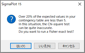 | ※ 分割表の期待値の 20% 以上が 5 未満の場合、カイ二乗検定は不正確になる可能性があります。 次のメッセージが表示され、フィッシャーの正確検定 (Fisher exact test) の実行を促される場合があります。 ![]() 「はい」をクリックした場合は、フィッシャーの正確検定のレポートが出力されます。 |