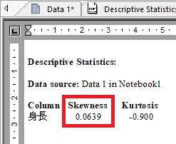 データが右側に裾が広がっている場合は、歪度は正の値になります。