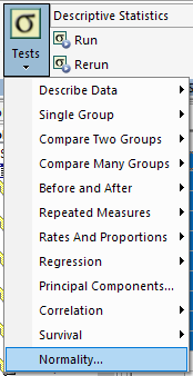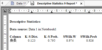 記述統計では、コルモゴロフ-スミルノフ検定とシャピロ-ウィルク検定の統計量及び確率がレポートに出力されます。 個別の正規性の検定の操作 Tests → Normality… を選択することで、有意差の結果を確認できます。