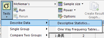 記述統計は、Analysis タブ→ Tests → Describe Data → Descriptive Statistics… を選択します。