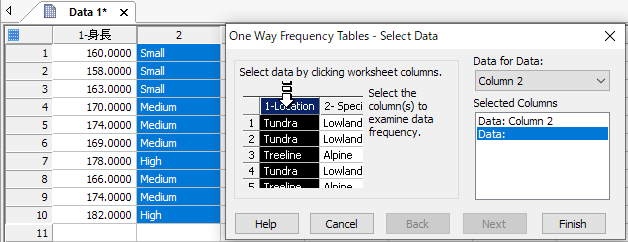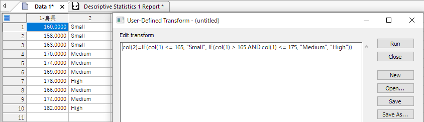 度数分布表を求めるには、まず、数値データをカテゴライズする操作を行います。ここでは、身長の数値データを Small、Medium、High の文字データにカテゴライズします。