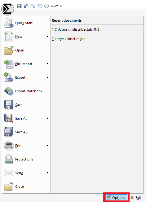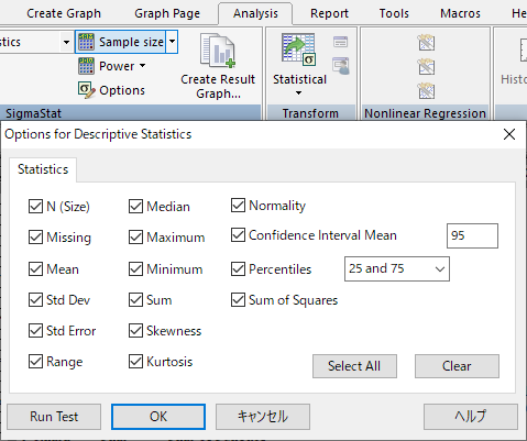 SigmaPlot では、Analysis タブ→ Options を選択することで、レポートに計算結果を表示する記述統計の項目を個別に選択することができます。