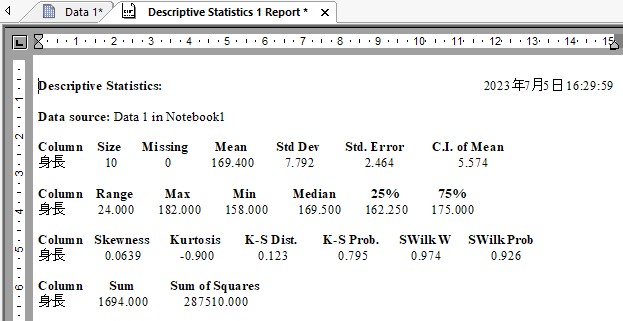 身長の例での SigmaPlot の計算結果は次のとおりです。
