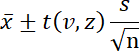 ここで、x バーは平均、 s は標本の標準偏差、 t(v, z) は、自由度 v = n -1 、標準正規パーセンタイル z = 1.96 の t 値です。