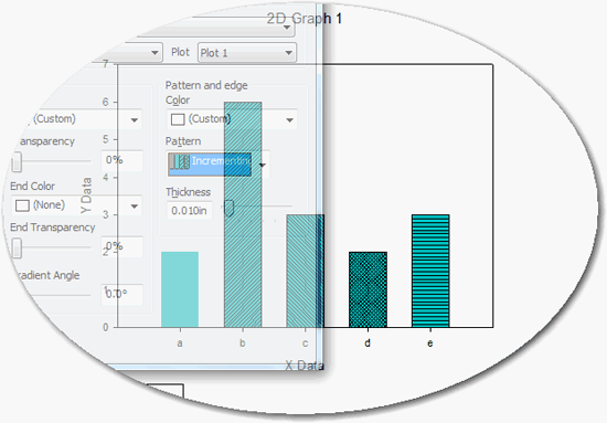 棒の設定を個別に変更するのではなく、一度にまとめて変更したいこともあるでしょう。このような場面こそ Graph Properties の出番です。ここでは、塗りつぶしのパターンをライン系列がインクリメント (順番に応じて自動的に変化) するような、ちょっと気取った感じに変更することにします。