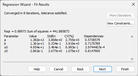 瞬時に Gaussian, 4 Parameter による当てはめがおこなわれます。Rsqr は当てはまりの良さを示す指標です。