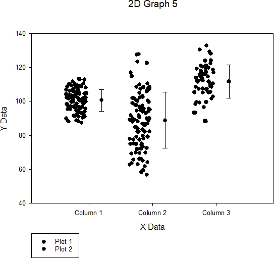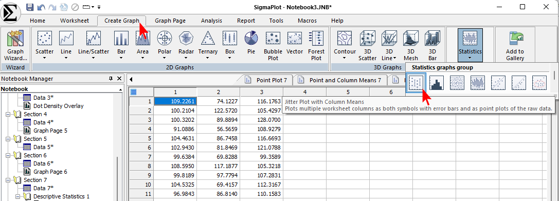 Create Graph タブの右側にある Statistics ボタンから、Jitter Plots with Column Means ボタンをクリックします。