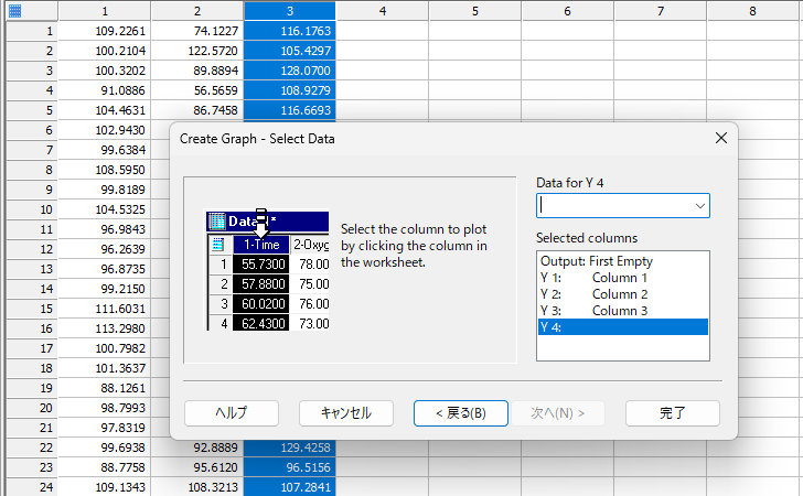 使用するデータ列を指定します。Output に First Empty、Y1~3 に列1~3を指定します。