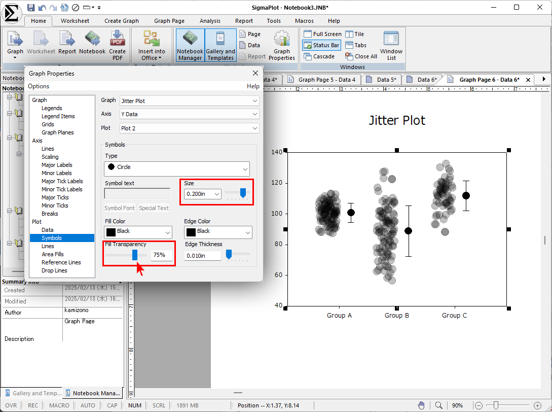 プロットの外観は、プロットをダブルクリックして、Symbols セクションの Size や Fill Transparency を使って変更できます。