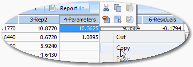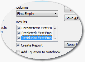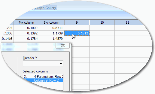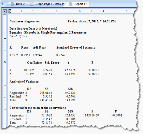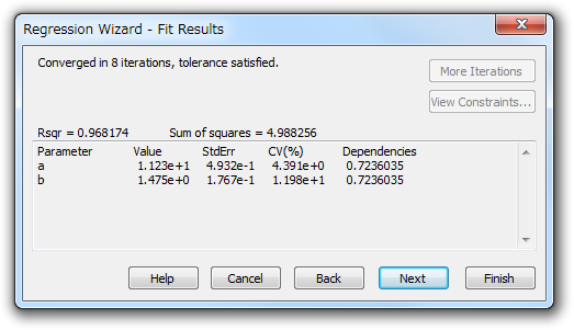 Regression Wizard (回帰ウィザード) によって、ワークシートに Parameter (パラメータ) と Residual (残差) の値が示され、フィッティングしたカーブのプロットおよび、統計レポートが作成されます。ここで、パラメータ “a” と “b” の関係を見てみましょう。
