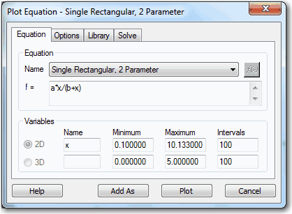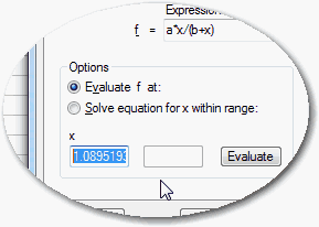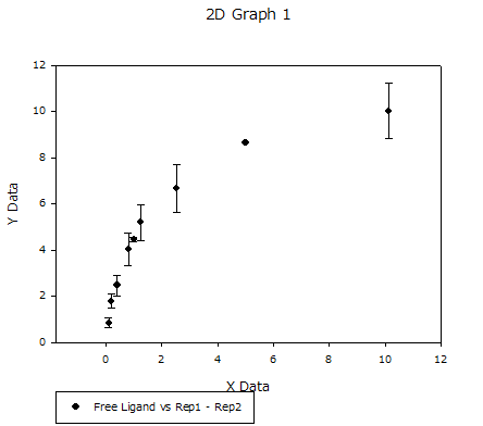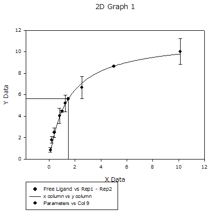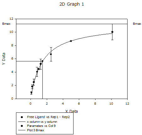 リガンド結合能の実験において、パラメータ “a” は Bmax 、パラメータ “b” は Kd です。Kdの値は、放射能でタグ付けされたリガンドの濃度で、特異的結合 (y値) が最大結合能 (Bmax) の半分となるものです。グラフには最大値の半分が約 5.6 であり、Bmax が約 11.2 となっており、実際にそうであることを示しています。
