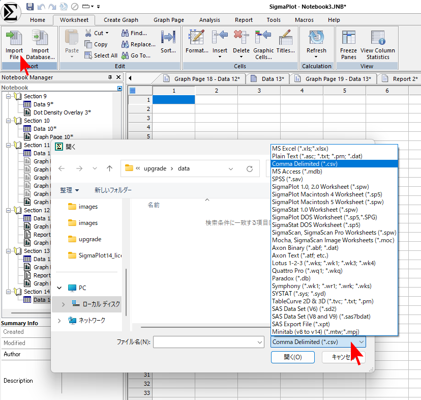SigmaPlot のノートブックファイル jnb は、上位互換性があります。旧バージョンの SigmaPlot で作成されたデータは、最新バージョン 16 でも問題なく読み込むことができます。
