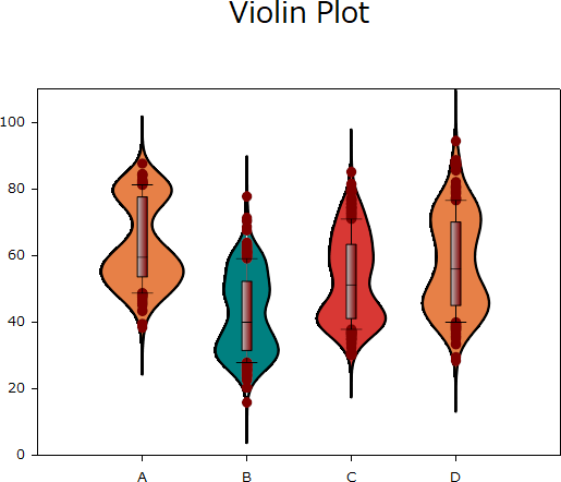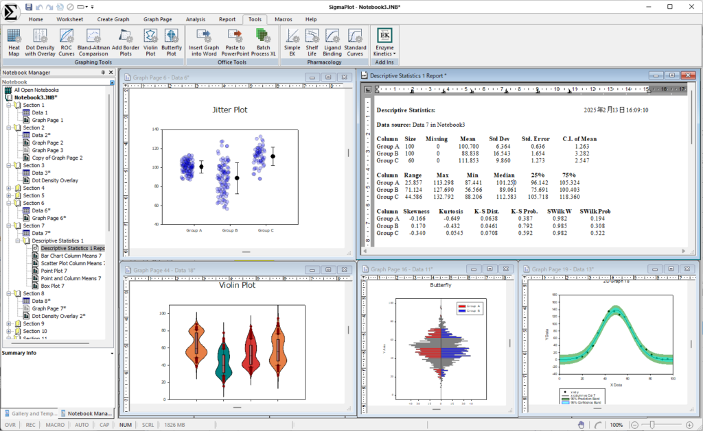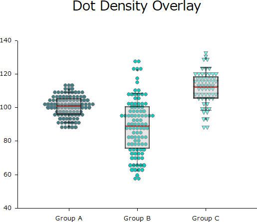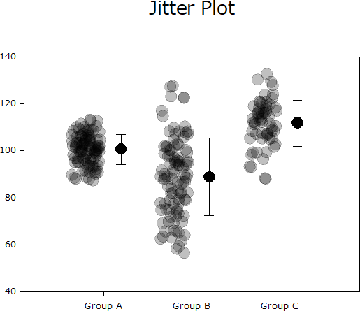 SigmaPlot では、v11 以降で統計解析パッケージ (SigmaStat) が標準装備されていますが、バージョン16までに統計グラフ機能が段階的に追加されてきました。バージョン 14.5 で追加された ジッター (Jitter) プロット、v15 で追加された Dot Density プロット、v16 で追加されたヴァイオリンプロット、バタフライプロットなど、いずれも取り扱うデータの全体像を分かりやすく示すためのプロットです。これらを使い分けることで目的や場面に応じた分かりやすいグラフを作成することができます。