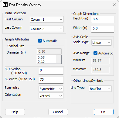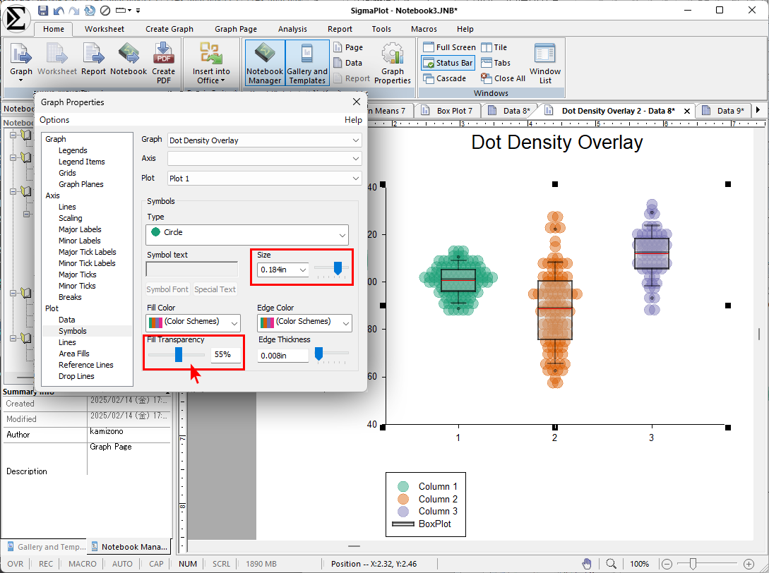 プロットの外観は、プロットをダブルクリックして、Symbols セクションの Size や Fill Transparency を使って変更できます。