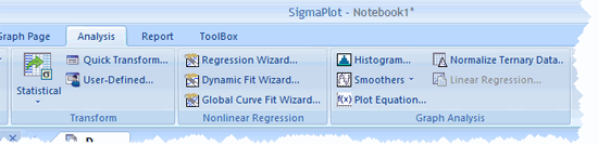 『トランスフォーム、回帰、グラフ分析』では、SigmaPlot のパワフルな数学機能のすべてを紹介します。これらの機能は Analysis タブの Transform、Nonlinear Regression、および Graph Analysis グループにそれぞれ用意されています。