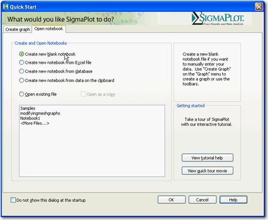 SigmaPlot を起動すると先ず Quick Start ダイアログボックスが Open notebook タブが選択された状態で表示されます。このダイアログボックスにはグラフの作成を開始するさまざまなオプションが用意されています。最も単純な方法は最初の選択肢 Create new blank notebook を選択することです。そして OK をクリックしてください。