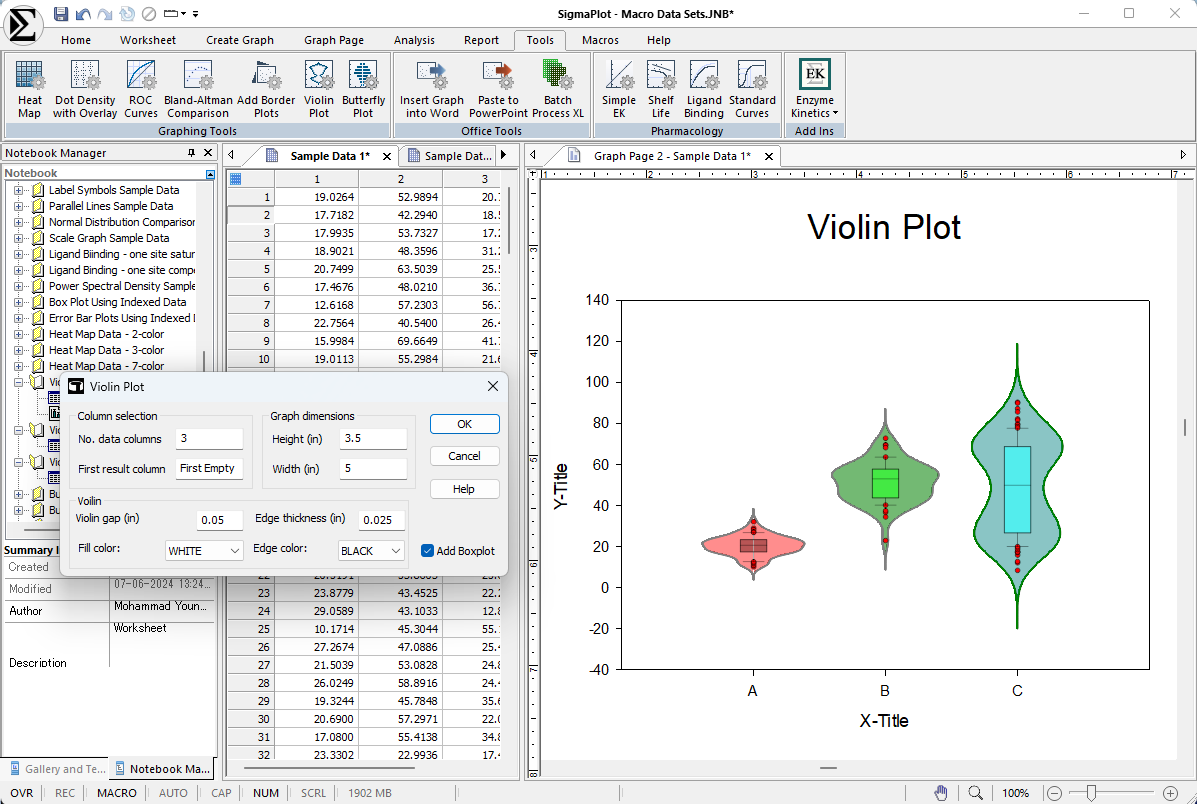 ヴァイオリンプロットは、1つ以上のグループの数値データの分布をカーネル密度曲線であらわします。このカーネル密度曲線には、ボックスプロットと組み合わせて表示させるオプションが用意されており、データ分布をより多面的にあらわすことができます。