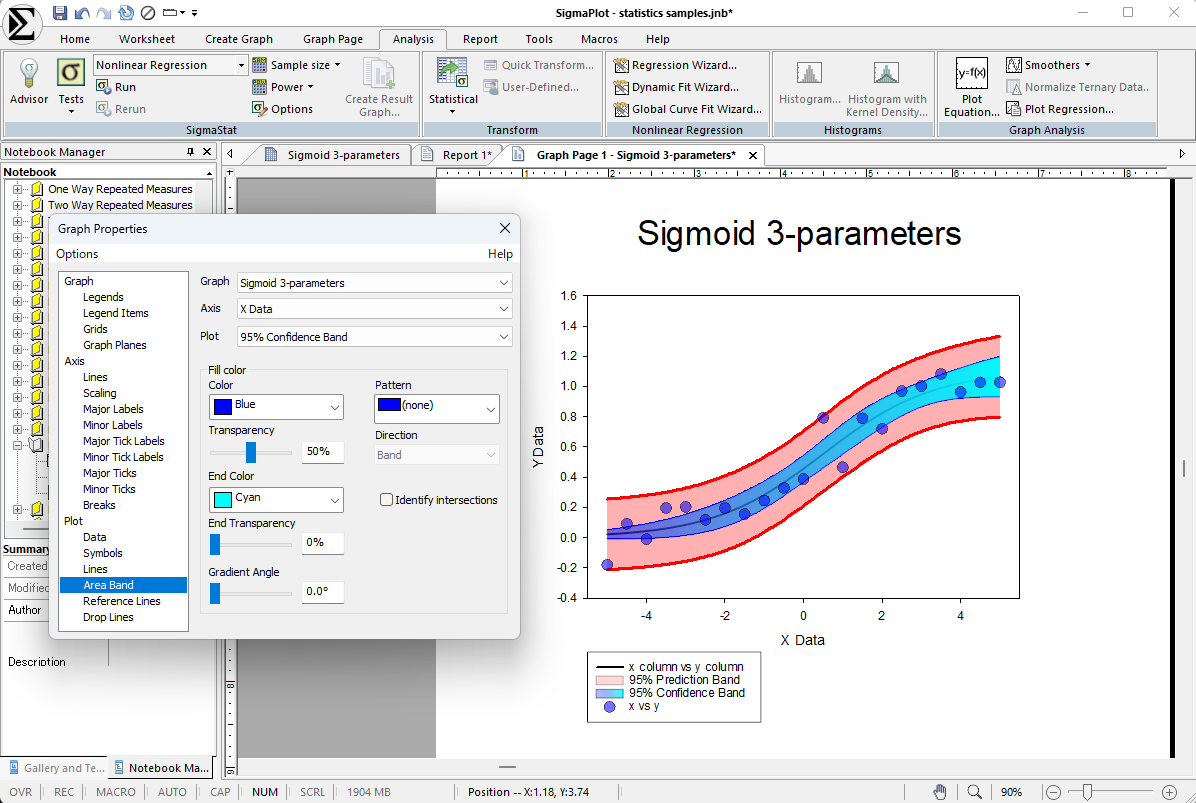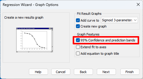 Regression Wizard の 95% confidence and prediction bands オプションを選択して表示される各ラインの範囲に任意のカラーを割り当てることができます。