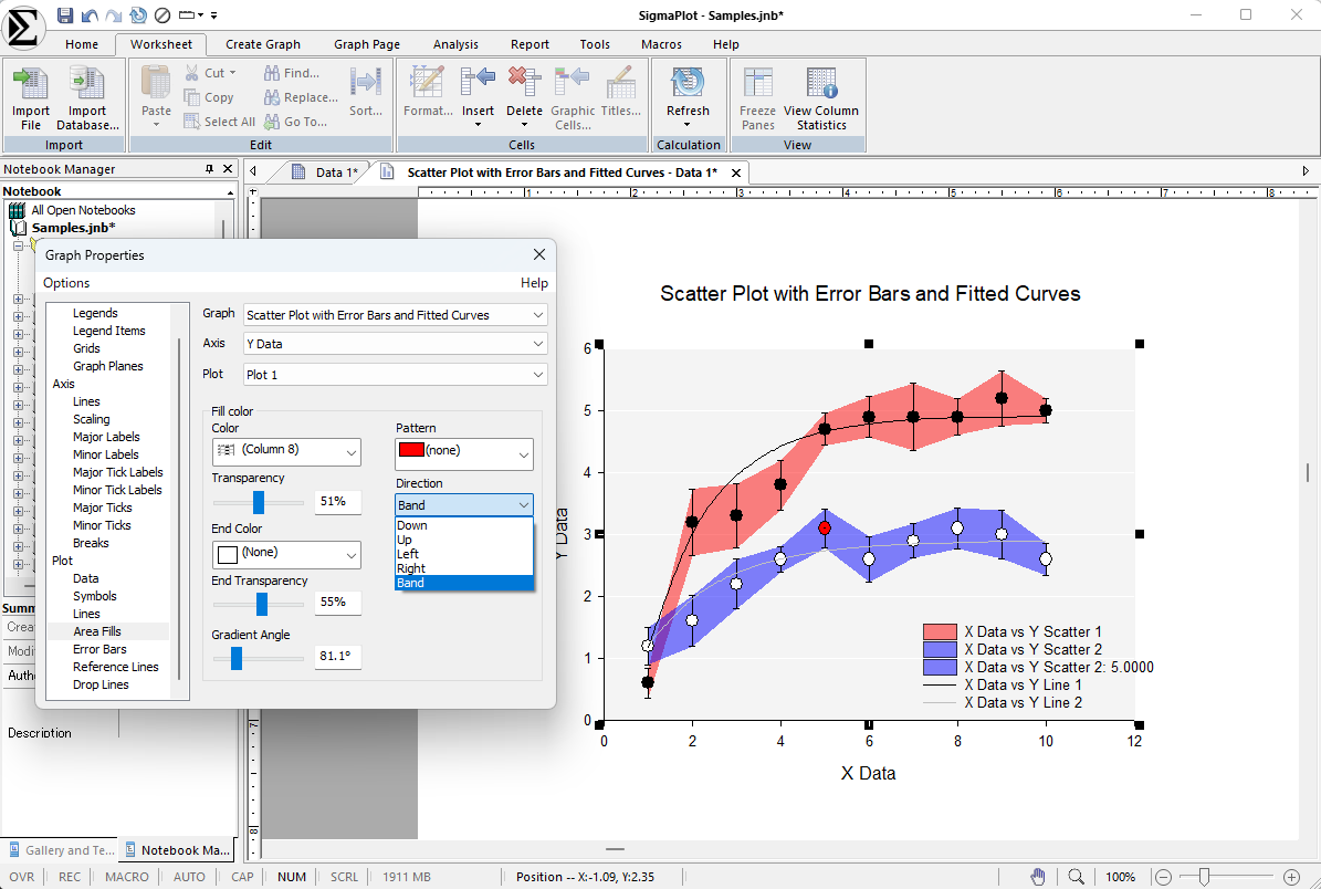 エラーバーの上端および下端をそれぞれつなげて帯状にあらわすものです。エラーバー付きプロットを作成し、Graph Properties の Area Fills で Direction を Band に指定することで、この範囲に任意のカラーを割り当てることができます。