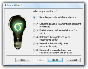 データにふさわしい統計的検定がどれであるかを知っておく必要はありません。アドバイザリー統計ウィザードを開き、使用するデータとプロジェクトに関するいくつかの質問に答えるだけで、適切な検定法がどれであるかを SigmaPlot がアドバイスしてくれます。また、基礎的前提のためのデータ・チェックも行われます。