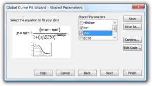 SigmaPlot の前バージョンでもグローバル・カーブフィット機能は利用できましたが、その手続きは非常に複雑で分かりにくいものでした。SigmaPlot 11 では、まったく新しいインターフェースが採用され、ユーザーは容易にグローバル・カーブフィットを設定できるようになりました。SigmaPlot 11 では数式のひとつまたは複数のパラメータを複数のデータセット間で容易に共有することできます。