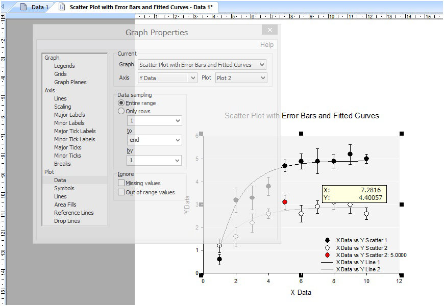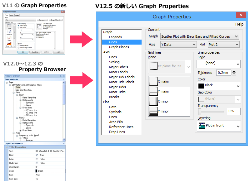 V11 の Graph Properties にあった Graph/Plot/Axis タブがなくなり、全項目は、2階層のツリー内へまとめられました。Graph/Plot/Axis のタブに以前からあった項目は全て、このツリー内で一度に確認できるようになりました。