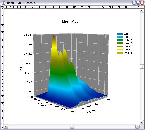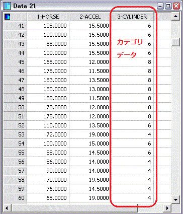 - ワークシートに下図のように X軸、Y軸のデータに加えて、カテゴリ・データを指定すれば、グラフを作成した際にカテゴリごとにマーカー (シンボル) を変えることができるようになりました。カテゴリにはテキストデータも使用できます。[2D Multiple scatter/Multiple line Graph style]