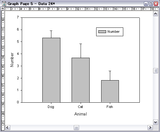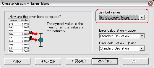 - また、各カテゴリの平均値をグラフへプロットし、エラーバーを表示することもできます(SigmaPlot 8 機能)。
