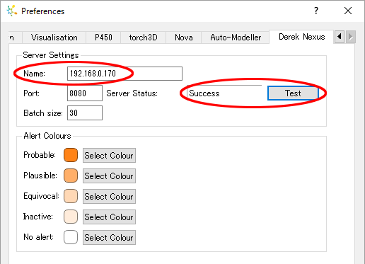 - File > Preferences を選択して Preferences の画面を開き、Derek Nexus タブの Name欄にサーバー名か IPアドレスを入力し、Testボタンをクリックします。「Success」と表示されれば、通信テスト成功です。