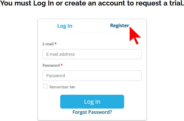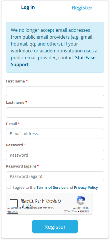 - 表示された画面の下側に Login 項目があります。Stat-Ease のアカウントをお持ちでなければ、Register をクリックして Register 画面を表示します。