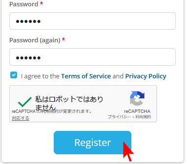 - ロボットではないことをチェックすると、写真を使った簡単な質問が表示されます。Register ボタンをクリックします。問題なく登録されたら、以下の画面が表示されます。登録したメールアドレス宛に確認メールが送信されますので、お使いのメールソフトで送信されたメールを確認してください。