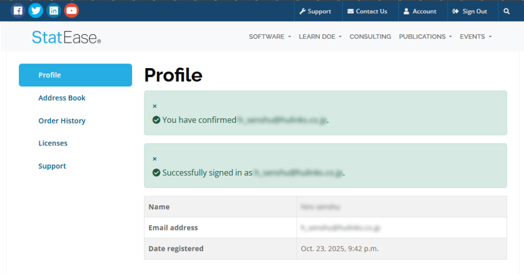 Stat-Ease 360 デモ版 (有効期間 14 日間) を入手するには、開発元のウェブサイトにユーザー登録をおこなう必要があります。以下の手順でユーザー登録を行ってください。
