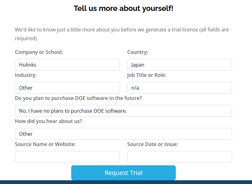 - トライアルページでは、もう一度、お客様に関連するさらに詳細な情報(会社名、国家、業種、など)を入力します。Request Trial ボタンをクリックします。