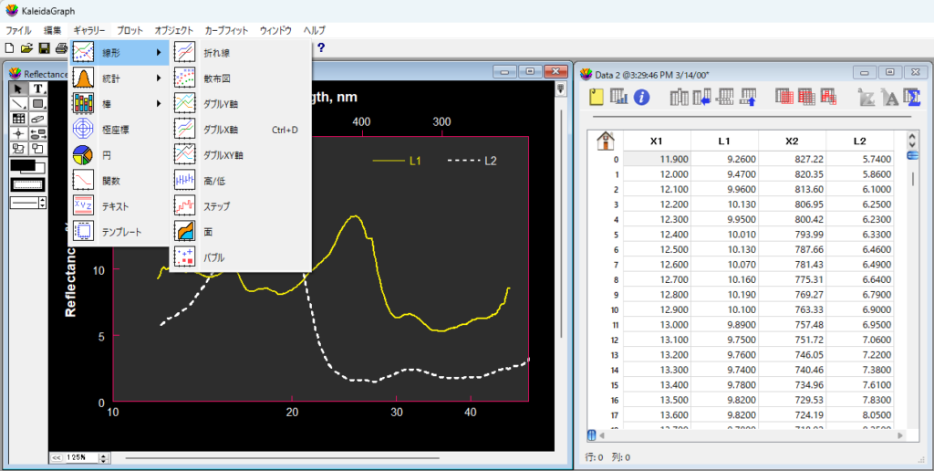 KaleidaGraph のワークシートを直接開いてデータ入力、Excel からのコピー&ペースト、テキストファイル (CSV 等) をインポートして、グラフを作成できます。線形、統計、棒、極座標、円、関数など、さまざまなグラフをギャラリーメニューから選択してデータを可視化します。