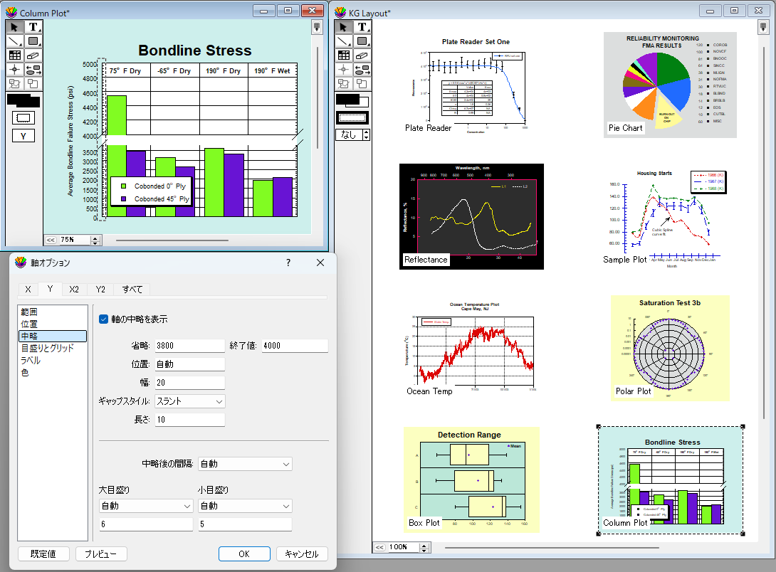 軸、目盛り、グリッド、ラベル、マーカー、線、色など、グラフのあらゆる要素がカスタマイズ可能です。 レイアウトウィンドウを使用して、1 つのページに複数のプロットを配置します。 コピー&ペーストでプロットやレイアウトを簡単に、さまざまな形式でエクスポートできます。