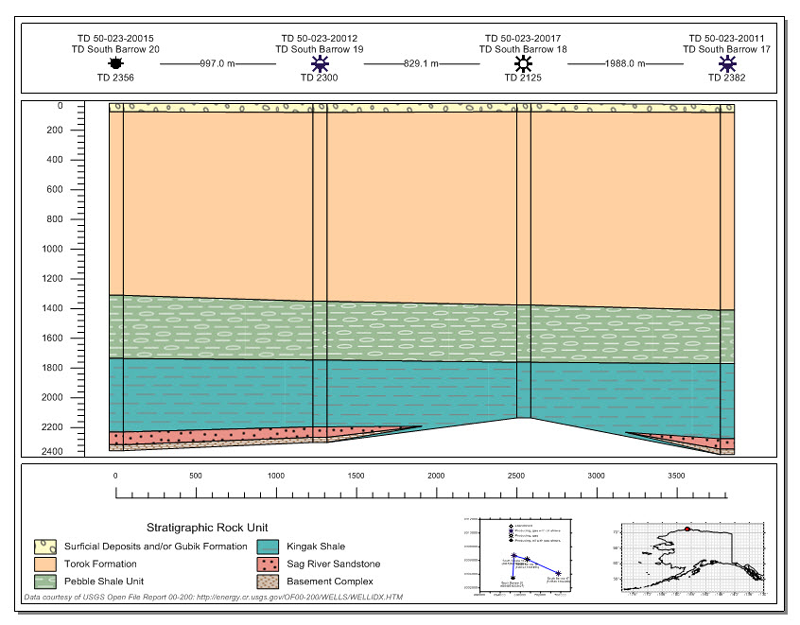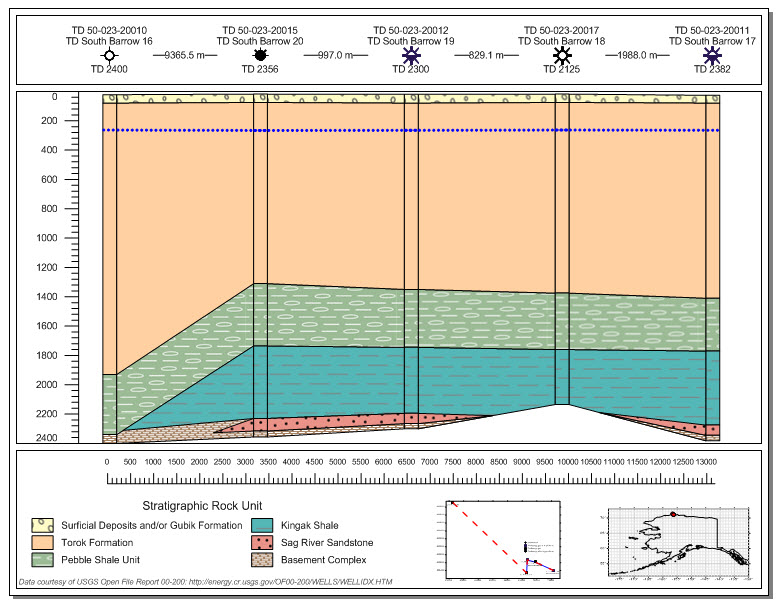 ▶Strater 5 のサンプルファイル “Cross Section.sdg” には、4 つの井戸がある断面、井戸ヘッダー、2つの差し込みマップ、水平断面、深度ログと凡例が含まれています。このファイルに新しい井戸を追加し、デフォルトのレイヤーを再編することにします。
