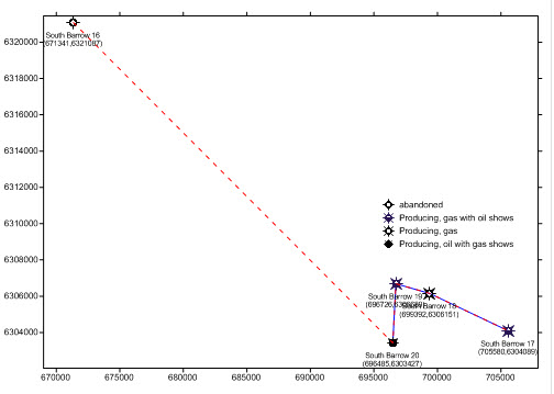 6. マップ上の井戸を左から右に順にクリックして、ENTER を押します。South Baroow 16 から始まる新しい well selector行が描画されます (右図の赤い線) 。