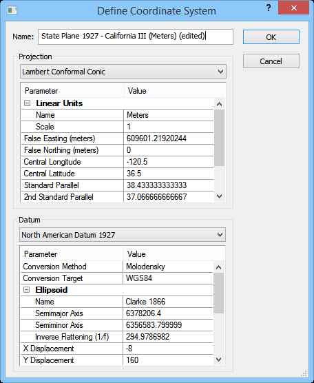 座標系を新規に定義するには、Assign Coordinate System ダイアログで、New ボタンをクリックします。測地系のパラメータは、Define Coordinate System ダイアログの Datum グループで指定することができます。Ellipsoid (楕円) は、Name (測地系の名称)、Semimajor Axis、Semiminor Axis、および、Inverse Flattening (1/f) について、カスタマイズできます。このとき Semimajor Axis, Semiminor Axis, および Inverse Flattening 比の単位はメートルで設定します。楕円体と測地系の定義についてよく分からない場合は、デフォルトの値を使用してください。これらの項目に関する詳しい情報は、以下の Projection References をご覧ください。 Projection References