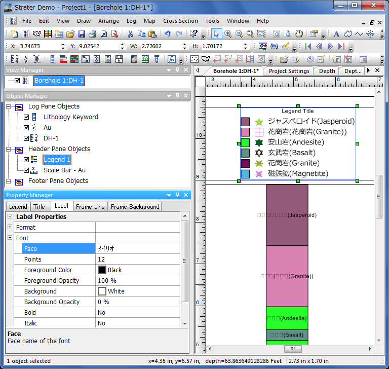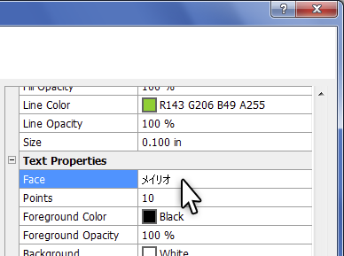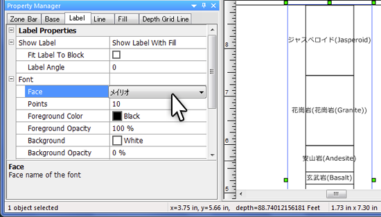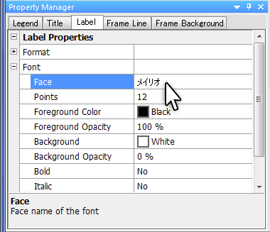 2.Property Manager で Label タブを選択し、Font | Face で日本語フォント (例:メイリオ) を選択します。