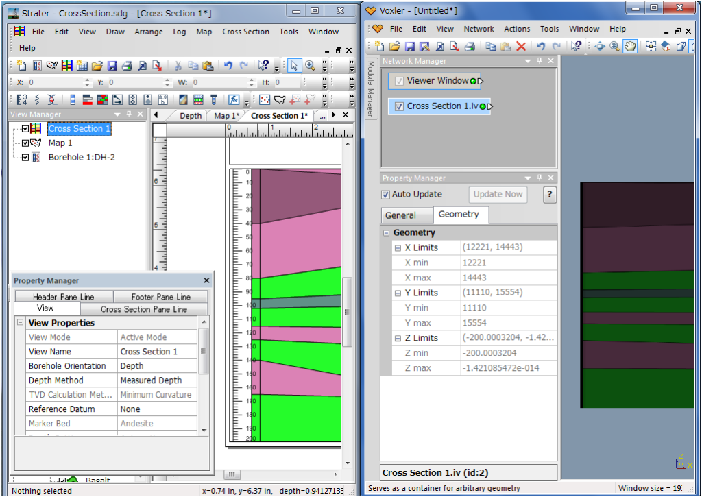 Strater 3 の断面図を深さ (Borehole Orientation = Depth) 表示した状態で Export to Voxler を実行すると Voxler 3では、Z 値の正負が変換されます。