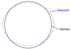 | 楕円体 (Ellipsoids) 精度を気にしない世界地図であれば、地球の形状は完全な球体であると仮定したとしても特に問題にはなりません。スケールの小さなマップである限り、それが球体 (sphere) であろうと楕円体 (ellipsoid) であろうと、その違いは地図からは判別できないからです。 しかし、実際の地球の形状は、その回転軸を垂直の向きであるとすると、およそ 1/300 だけ縦よりも横が長い楕円体 (あるいは、玉子型) です。ある程度の精度を要するスケールの大きいマップを作成するには、この形状を考慮に入れる必要があります。 ![]() 球体 (黒の実線) と楕円体 (青の点線) を重ね合わせた例。 楕円体が球体に比べて地球の形状をよりよく近似できるといっても、地球の表面は完全に均一な曲線ではないため、楕円体を用いて地球を表現したとしても、それはあくまで近似値に過ぎません。地図製作者が地域ごとに正確な地図の作成を試みようと、微妙に異なる幾つもの楕円体表現をこれまで使い分けてきたのは、こうした背景があるからなのです。 楕円体は、それに使用する楕円と、その楕円の回転量とで定義します。楕円には軸が2つあります。Semimajor Axis (長軸半径) は、長い方の半径、Semiminor Axis (短軸半径) は短い方の半径になります。Semiminor Axis (短軸半径)、すなわち、短い方の半径を回転することで、回転楕円体が生成されます。 ![]() 球体 (黒の実線) と楕円体 (青の点線) を重ね合わせた例。 Surfer, Strater では、Semimajor Axis (長軸) と Semiminor Axis (短軸)、または、Semimajor Axis (長軸) と Inverse Flattening (1/f) 値 (扁平率の逆数) によって楕円を定義します。扁平率の値は、ゼロから 1 の範囲になりますので、Inverse Flattening (1/f) 値は必ず1より大きい値をとります。扁平率の値 (flattening value) は次式で定義されます: