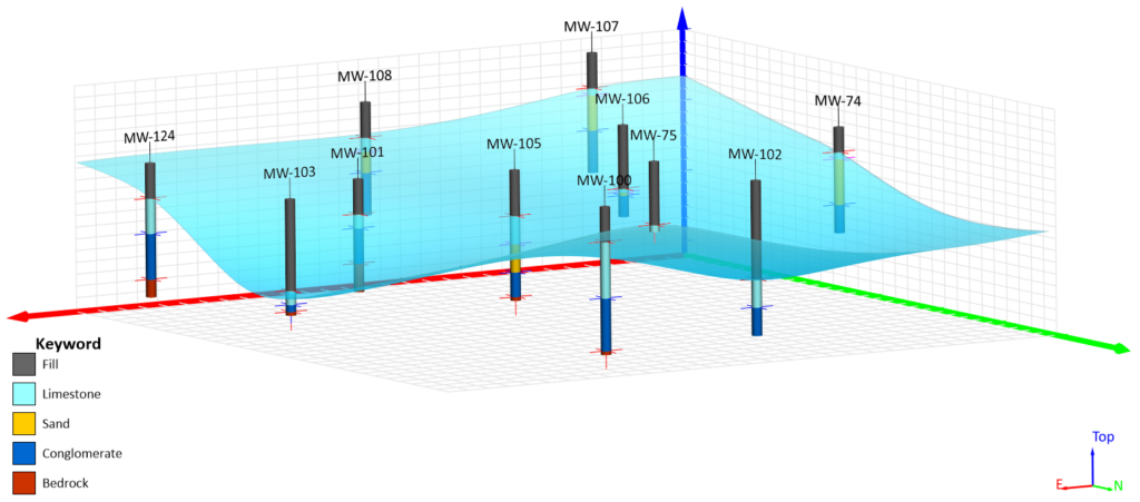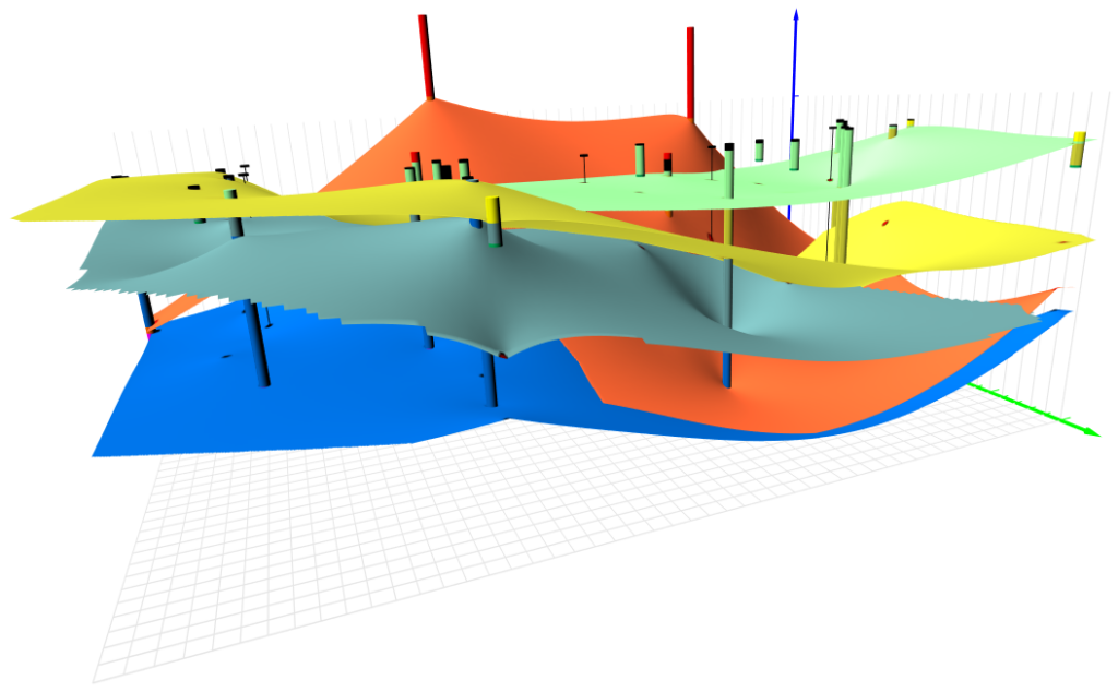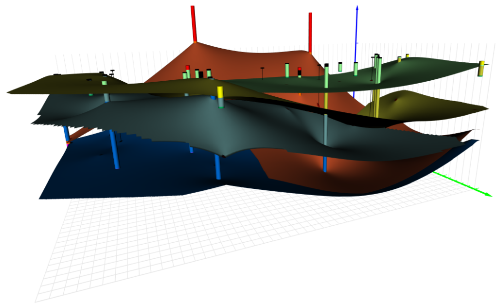 ドリルホールデータには地中に関する貴重な情報があります。Surfer の 3D ドリルホールレイヤーは、そのデータをカラフルで分かりやすいグラフィック形式で表示します。では、さらに一歩進めてみましょう!ドリルホールデータをインポートして 3D ビューで表示できたら、そのデータから接触点(または「ピック」)を作成し、それらの間のサーフェスを作成しましょう。
