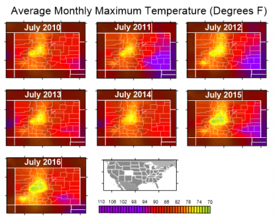毎年7月の毎日のデータがすべて平均化され、等高線図を作成して比較できるようになりました。私は比較が簡単にできるように、同じ等高線間隔とカラーマップを使用して、年度毎に等高線マップを作成しました。コロラド州が世界的な傾向と同じであるのかどうか確認するため、マップの縮尺を統一し、並べて配置しました。結果の等高線図は以下のとおりです。各年の月平均温度は異なりますが、年ごとの空間傾向を特定することは困難です。今年の7月が、ダウンロードしたデータの年よりも熱いとは断定できません。