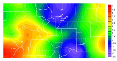 下記のように、過去6年の平均気温と比較した今年の7月の気温偏差を示す等高線図が Surfer で生成されました。このマップは、7月の気温はほとんどの中央山岳地帯(地図の中央部分)では変わらず、唯一の顕著な温度上昇は、南西部とコロラド州の東の平地であることがわかります。