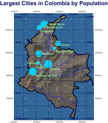 下図は、経緯度線を追加した後のコロンビアの地図です。灰色の十字はメートル単位のマップ・グリッドとして経緯度線を表し、青い線は度、分、秒フォーマットのラベルのついた緯度と経度の線を表しています。