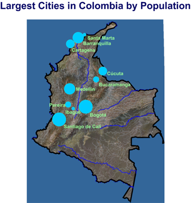 この機能のデモ用に、MAGNA-SIRGAS 座標系で投影されているコロンビアの地図を作成しました。単位にはメートルを使用しています。グリッド線の交点をメートルで表すためにマップ・グリッドとして経緯度線を追加し、緯度と経度の線を表示するために 2つ目の経緯度線を追加しました。下の画像は、経緯度線を追加する前のマップです。