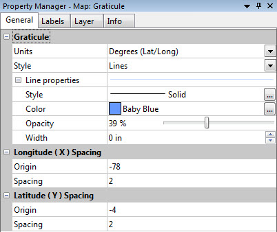 Property Manager の Layer ページと Info ページは、他のオブジェクトの場合の Layer ページと Info ページと同じです。Layer ページではレイヤーの不透明度を変更し、Info ページでは属性を編集することができます。Property Manager の General ページには、経緯度線で使用する単位を指定するオプションがあります。Units リストの選択肢は、マップのターゲット座標系によって変わります。マップを投影した場合に使用可能な単位には Degrees (Lat/Long) (緯度/経度の度) 、Millimeters (ミリメートル) 、Centimeters (センチメートル) 、Meters (メートル) 、Kilometers (キロメートル) 、Inches (インチ) 、Feet (フィート) 、Survey Feet (測量フィート) 、Yards (ヤード) 、Miles (マイル) があります。マップが既知の単位を使用している場合は、上記の長さ単位が使用できます。マップに測量基準点がある場合は、Degrees (Lat/Long) と Unknown map units が使用できます。マップが参照されていない場合は、Unknown map units のみ使用できます。Style では、マップ全体に渡って線を表示するかどうか、または線が交差する箇所に十字を表示するかどうかを指定します。Line properties セクションでは、線や十字のプロパティを設定します。General ページの 2つのセクションでは、X 方向および Y 方向の経緯度線の線間隔を設定できます。経緯度線は、指定した Origin から描画され、指定した Spacing の値によって、両側に等間隔で配置されます。以下は、Graticule< em=””> オブジェクトの Property Manager の General ページの例です。