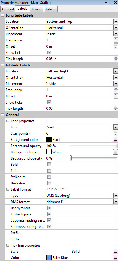 Property Manager の Labels ページには、経緯度線ラベルのオプションとラベルのフォーマットが表示されます。Longitude Labels (経度のラベル) および Latitude Labels (緯度のラベル) には別に、Location (場所) 、Orientation (方向) 、Placement (配置) 、Frequency (度数) 、Offset (オフセット) 、Show ticks (目盛りの表示) 、Tick length (目盛りの長さ) などのプロパティを設定できます。General セクションのプロパティは、経緯度線の全てのラベル/目盛りに適用されます。