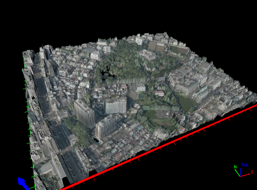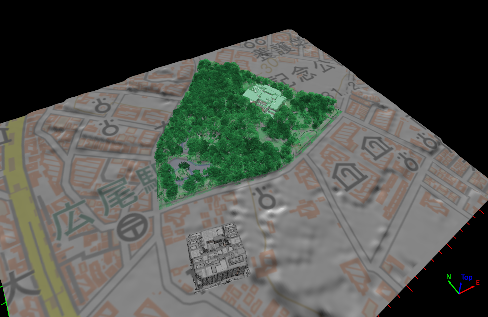 Surfer には異なる形式のデータ (画像、DEM, text, shp, DXF, …) を自由に重ね合わせ可能ですが、LiDAR データの一部を切り抜いて Surfer で作成した各種サーフェスモデルと組み合わせることも可能です。象徴的な建物を配置することで場所を示しているのかをわかりやすく伝えることができます。