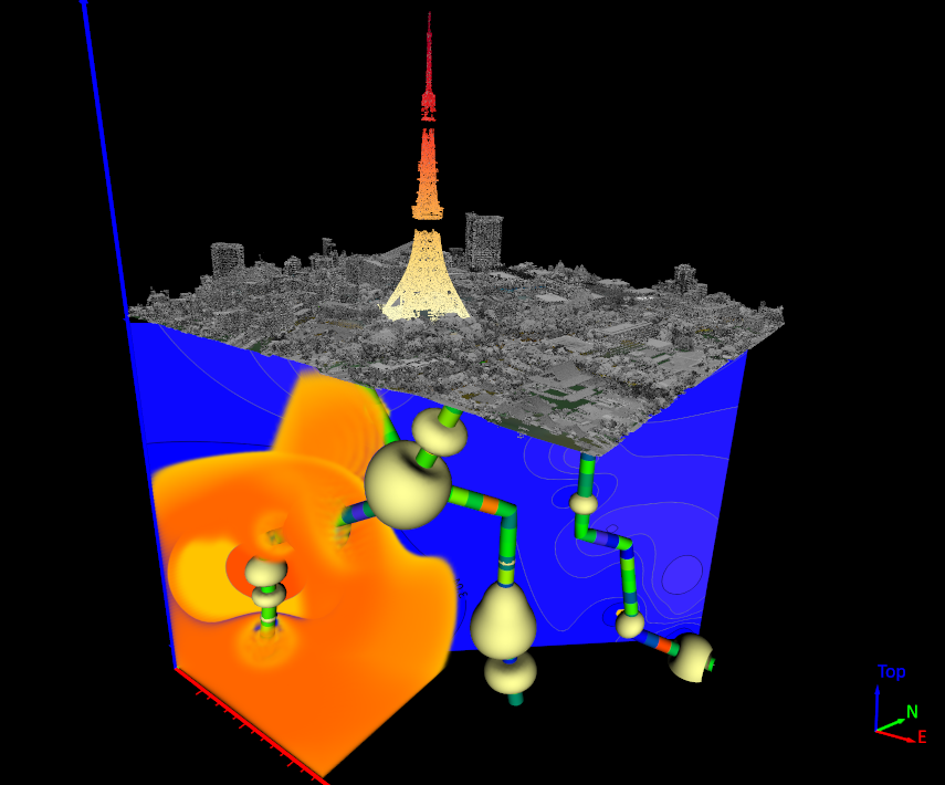 お茶の水~神保町付近の様子。ビル(東京科学大学、明治大学)の高さと濠の深さや地表面の高低差を、分かりやすく説明できます。 ![]() | 3D グリッドデータにサーフェスマップを重ね合わせるのと同様に LiDAR データも問題なく重ね合わせることが可能です。地上と地下空間の情報を組み合わせることができます(※ドリルホールデータは架空のものです) ![]() |